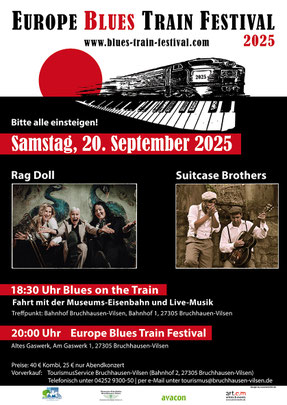 A v září se těšíme na další akci Europe Blues Train Festivalu v Bruchhausen-Vilsen, kde bude následovat akustické blues v nejstarší muzejní železnici a s následujícím koncertem. V sestavě se objeví Rag Doll z Berlína a Suitcase Brothers z Barcelony.